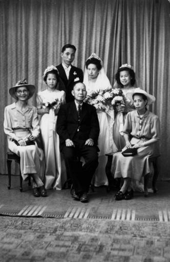 | Keywords: StateLibQld 1 193627 Wedding of Philip and Edith Leong, 1944.jpg en Wedding of Philip and Edith Leong 1944 Wedding group photograph of Philip and Edith Leong their bridesmaids and family members 1944 handle 10462/deriv/113416 Item is held by John Oxley Library State Library of Queensland PD-Australia StateLibQld-License People with hats Portraits of Queensland Wedding ceremonies in Australia Wedding dresses in Australia Brides of Australia Bridesmaids of Australia Grooms of Australia Headgear of Australia Women's clothing of Australia Men's clothing of Australia 1944 in Australia Black and white photographic portraits |