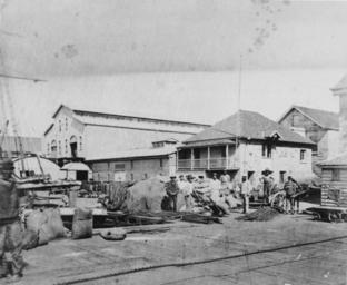 | Keywords: StateLibQld 1 199679 Buildings and wharves off the Town Reach of the Brisbane River, ca. 1880.jpg en Buildings and wharves off the Town Reach of the Brisbane River ca 1880 Warehouses and businesses right on the Town Reach wharves situated at the end of Eagle Street near its intersection with Charlotte Street Brisbane Hipwood and Sutton's coppersmithing and brass foundry in the middle of the photograph was at 15 Eagle Street Information taken from Queensland P O D 1883 Busy scene of the maritime heart of Brisbane including merchants and carriers handling goods near the jetty circa 1880 handle 10462/deriv/97377 Item is held by John Oxley Library State Library of Queensland Wright G P PD-Australia StateLibQld-License Wharves in Brisbane Stone houses in Australia Stone buildings in Queensland Sacks Men's clothing of Australia Warehouses in Australia Black and white photographs |