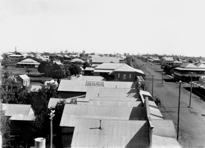 | Keywords: StateLibQld 1 207497 Rooftops of Roma, ca. 1920.jpg en Rooftops of Roma ca 1920 Aerial view of Roma showing corrugated iron roofs houses and buildings telegraph poles and a water tank A hotel is visible to the far right of the image This image was probably taken from the lookout on the School of Arts Hotel on the south east corner of McDowall and Hawthorne Streets circa 1920 handle 10462/deriv/130879 Item is held by John Oxley Library State Library of Queensland PD-Australia StateLibQld-License Views of Roma Queensland 1920 in Queensland Black and white photographs |