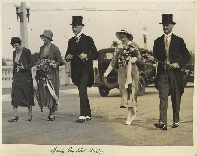| Keywords: StateLibQld 1 232967 Governor Goodwin and party walking across the Grey Street Bridge after its opening.jpg en Governor Goodwin and party walking across the Grey Street Bridge after its opening Sir John and Lady Goodwin with Neil Campbell and his wife walking over the Grey Street Bridge The men are wearing morning dress top hats and spats Lady Goodwin and an unidentified woman are carrying bouquets circa 1931 handle 10462/deriv/32498 Item is held by John Oxley Library State Library of Queensland PD-Australia StateLibQld-License Flower bouquets in Australia Women's clothing of Australia William Jolly Bridge John Goodwin governor Black and white photographs Morning dress |