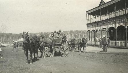 | Keywords: StateLibQld 1 240650 Outside the Lake Eacham Hotel in a wagon.jpg en Outside the Lake Eacham Hotel in a wagon <br /> Party leaving Yungaburra for Lake Barrine This photograph is part of a collection which records the Commissioner's inspection of the North Queensland railways 1912-07-01 handle 10462/deriv/127448 Item is held by John Oxley Library State Library of Queensland PD-Australia StateLibQld-License Horse-drawn vehicles in Australia Men's clothing of Australia Roads in Far North Queensland 1912 in Australia Black and white photographs Eacham Queensland Lake Eacham Hotel Commissioner's inspection tour of North Queensland 1912 |
