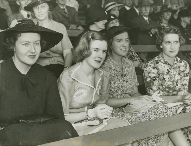 Keywords: StateLibQld 1 251388 Young ladies pictured at the cricket, Brisbane.jpg supplied with photograph handle 10462/deriv/121246 Item is held by John Oxley Library State Library of Queensland Jackman George; Contributor s Queensland Newspapers Pty Ltd PD-Australia StateLibQld-License People with hats Sports in Brisbane Women's clothing of Australia Headgear of Australia Hair fashion in Australia Spectators in Australia Black and white photographs |
