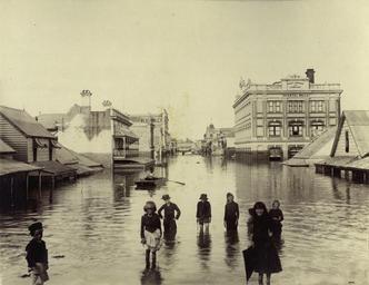Keywords: StateLibQld 1 254474 Children playing in the flooded streets, Brisbane, 1893.jpg en Children playing in the flooded streets Brisbane 1893 Children are ankle deep in water in the middle of Mary Street during the 1893 floods Floodwaters are almost as high as the first floor of some buildings in the street 1893 handle 10462/deriv/40097 Item is held by John Oxley Library State Library of Queensland PD-Australia StateLibQld-License 1893 Brisbane flood Mary Street Brisbane Children's clothing of Australia Black and white photographs |