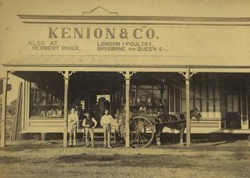 | Keywords: StateLibQld 1 254571 Kenion and Co. general store, Cairns, 1887.jpg en Kenion Co general store Cairns 1887 Three men are standing outside the store under the verandah A horse and cart is waiting at the steps of the store and the shop windows display a wide range of products 1887 handle 10462/deriv/40169 Item is held by John Oxley Library State Library of Queensland PD-Australia StateLibQld-License General stores in Queensland Commerce buildings in Cairns 1887 in Queensland Black and white photographs |