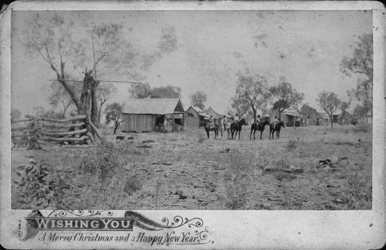 Keywords: StateLibQld 1 290475 Christmas card from Mount Abundance Station, ca. 1898.jpg en Christmas card from Mount Abundance Station ca 1898 View of the farm sheds and horses At the bottom of the card is a greeting 'Wishing you a Merry Christmas and a Happy New Year' Mount Abundance Station was settled in 1847 and is situated in the Roma area of Queensland Allan MacPherson arrived in the area with 20 men 8000 sheep and some cattle and established Mount Abundance Station on Muckadilla Creek circa 1898 handle 10462/deriv/149462 Item is held by John Oxley Library State Library of Queensland PD-Australia StateLibQld-License Sheep and cattle stations in Queensland Farm buildings in Australia Horses of Queensland 1898 in Queensland Christmas in Australia Black and white photographs Christmas cards of Australia |