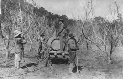 Keywords: StateLibQld 1 45443 Spraying fruit trees in an orchard at Ballandean, ca. 1900.jpg en Spraying fruit trees in an orchard at Ballandean ca 1900 Spraying the fruit trees on Hodgson's farm Harry Dodd is on the cart George Chapman is leaning on the cart Rice on the left with George Parker on the right both using the spray guns circa 1900 handle 10462/deriv/144521 Item is held by John Oxley Library State Library of Queensland PD-Australia StateLibQld-License Orchards in Australia Farmers from Australia Manual workers of Australia Ballandean Queensland Black and white photographs |