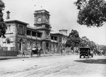 Keywords: StateLibQld 1 76343 Street scene outside the Post Office, Toowoomba, ca. 1909.jpg en Street scene outside the Post Office Toowoomba ca 1909 Motor vehicles mix with horses and horsedrawn vehicles in the street Pedestrians are walking on the footpath and two gentlemen are standing in the doorway of the post office The dome from the Courthouse can be seen over the roof of the Post Office circa 1909 handle 10462/deriv/88336 Item is held by John Oxley Library State Library of Queensland PD-Australia StateLibQld-License Post offices in Queensland Streets in Toowoomba Vehicles in Australia Horse-drawn vehicles in Australia 1909 in Queensland Black and white photographs of buildings Toowoomba Post Office