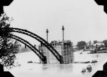| Keywords: StateLibQld 1 86040 Incomplete William Jolly Bridge photographed during the 1931 Brisbane flood.jpg en Incomplete William Jolly Bridge photographed during the 1931 Brisbane flood The William Jolly Bridge which linked North Quay on the north bank of the Brisbane River to Grey Street on the south bank photographed during the 1931 flood which temporarily halted its construction The bridge opened to traffic on 30 March 1932 known then as the Grey Street Bridge 'Amongst the interesting features of the Bridge the length of which is 1634 feet are the three main arches over the river of 238 ft centres each rib consisting of structural steel fabricated under a sub-contract let by Messrs M R Hornibrook Ltd to Messrs Evans Deakin and Co Brisbane This steelwork was designed to support the concrete during construction without falsework ' Information taken from Souvenir official opening of Grey Street Bridge 1932 1931-02-07 handle 10462/deriv/62772 Item is held by John Oxley Library State Library of Queensland PD-Australia StateLibQld-License William Jolly Bridge construction 1931 Brisbane flood Black and white photographs of bridges Black and white photographs of Brisbane |