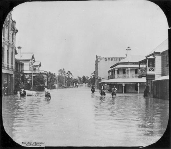 | Keywords: StateLibQld 1 89764 Cattle in Edward Street, Brisbane, during the 1890 flood.jpg en Cattle in Edward Street Brisbane during the 1890 flood Cattle in Edward Street Brisbane between Margaret and Mary Streets during the 1890 flood being rounded up by men some wading and some on horseback The Botanical Gardens are visible at the end of the street 1890 handle 10462/deriv/66346 Item is held by John Oxley Library State Library of Queensland PD-Australia StateLibQld-License 1890 Brisbane flood Edward Street Brisbane Black and white photographs |