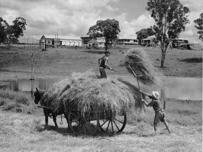 | Keywords: StateLibQld 2 115556 Loading hay at St Lucia, Brisbane, Queensland, 1936.jpg en Loading hay at St Lucia Brisbane Queensland 1936 Loading hay onto a horsedrawn wagon at the Farm School St Lucia The houses in the background were situated approximately 30 yards to the right of the Foundation Stone near the Administration Block at the University of Queensland 1936 handle 10462/deriv/135394 Item is held by John Oxley Library State Library of Queensland PD-Australia StateLibQld-License Horse-drawn carts in Queensland Black and white photographs St Lucia Queensland 1036 in Brisbane Hay wagons Horses of Brisbane |