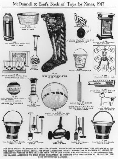 | Keywords: StateLibQld 2 119296 Toys from McDonnell and East deparment store in Brisbane, 1917.jpg en Toys from McDonnell East deparment store in Brisbane 1917 Part of McDonnell and East Department Store's mail order catalogue for children's toys Postage rates are shown at the bottom of the advertisement 1917 handle 10462/deriv/108361 Item is held by John Oxley Library State Library of Queensland PD-Australia StateLibQld-License Advertisements in Australia Black and white photographs Christmas stockings 1917 in Australia Sports equipment Stationery Balls McDonnell East Ltd Building 1917 advertisements |