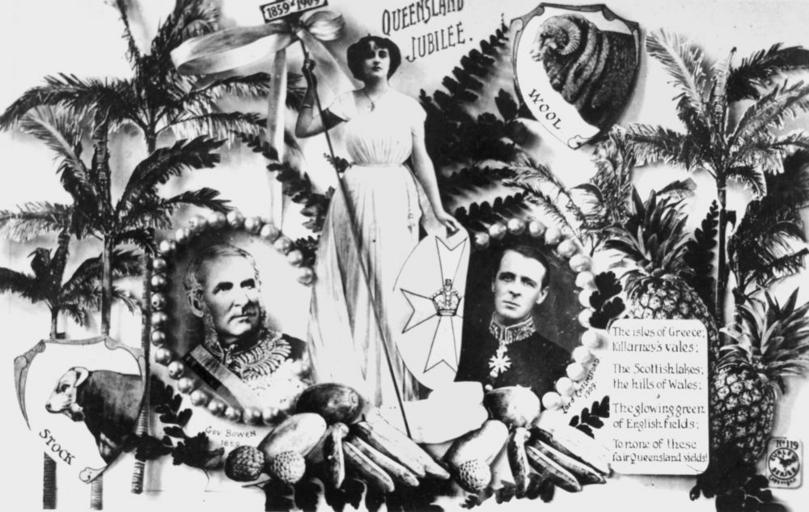 | Keywords: StateLibQld 2 120452 Queensland Jubilee 1859-1909 postcard including the allegorical figure of Britannia^, Governor Bowen and Lord Chelmsford.jpg en Queensland Jubilee 1859-1909 postcard including the allegorical figure of Britannia Governor Bowen and Lord Chelmsford Represented is tropical fruit flora wool and stock and the state badge the imperial crown superimposed on a Maltese cross A poem is also included The isles of Greece;/Killarney's vales;/The Scottish Lakes;/The hills of Wales;/The glowing green/of English fields /To none of these/fair Queensland yields Postcard is number 119 in the Curlew Series 1909 handle 10462/deriv/109229 Copied and digitised from an original Falk and Wilkins colour postcard PD-Australia StateLibQld-License Black and white photographs 1909 in Australia Anniversaries Queensland Images of postcards from the State Library of Queensland |