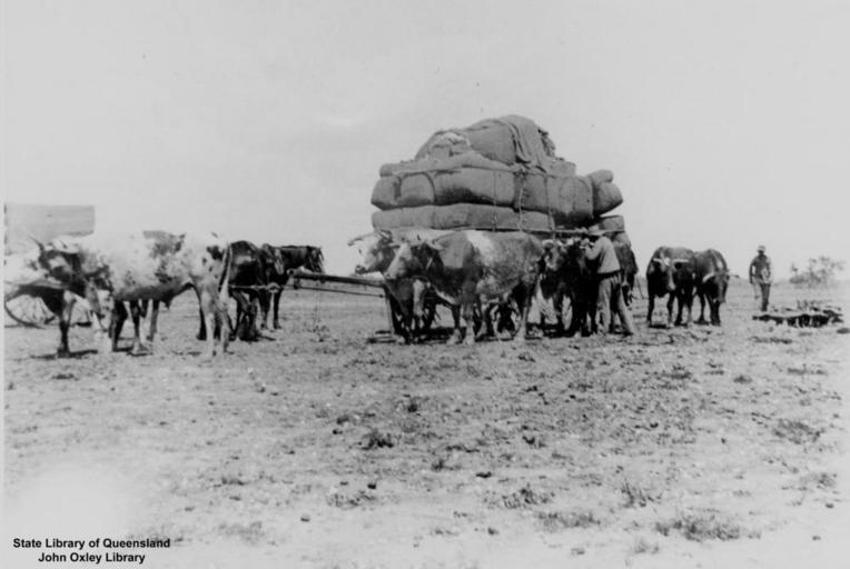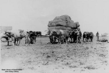 | Keywords: StateLibQld 2 145275 Bullock teams transporting wool at Yambacollie Station, Queensland, 1920s.jpg en Bullock teams transporting wool at Yambacollie Station Queensland 1920s Bullock team and a loaded wagon with bales of wool at Yambacollie Queensland handle 10462/deriv/22654 Item is held by John Oxley Library State Library of Queensland PD-Australia StateLibQld-License Wool production in Australia Black and white photographs Wool wagons in Australia Bullock teams in Queensland Yambacollie Station |