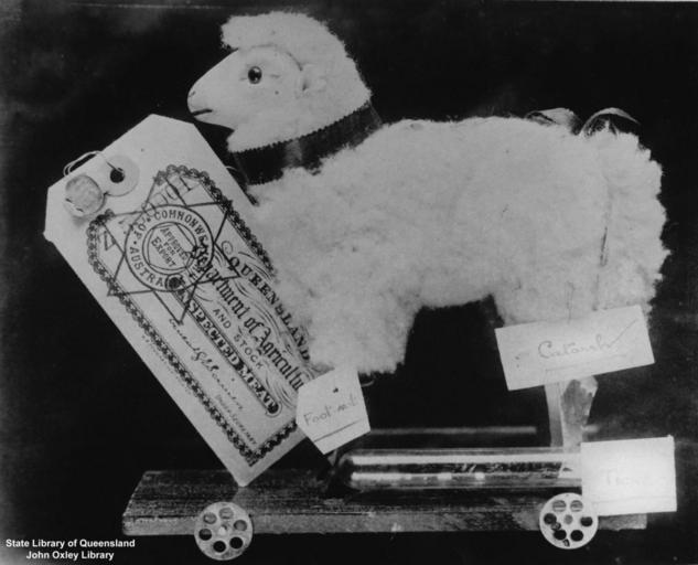 Keywords: StateLibQld 2 157823 Miniature model of a sheep with a meat inspectors tag, 1907.jpg en Miniature model of a sheep with a meat inspectors tag 1907 Miniature model of a sheep with the Queensland Department of Agriculture and Stock meat inspectors tag The small model has additional tags that read 'foot-rot' and 'catarrh' 1907 handle 10462/deriv/7816 Item is held by John Oxley Library State Library of Queensland PD-Australia StateLibQld-License Black and white photographs Models from Australia 1907 in Australia Documents Wool |
