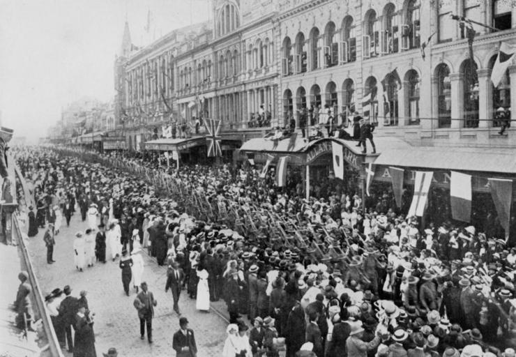 | Keywords: StateLibQld 2 179687 Military parade of the 1st Contingent, marching in Queen Street, Brisbane, 1914.jpg en Military parade of the 1st Contingent marching in Queen Street Brisbane 1914 1914 handle 10462/deriv/102621 Item is held by John Oxley Library State Library of Queensland PD-Australia StateLibQld-License Photographs of flags of Australia Military people of Australia Black and white photographs Australia in World War I Queen Street Brisbane Soldiers of Australia Crowds in Australia 1914 in Queensland Australian Army Parades in Queensland |