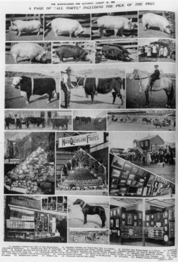 | Keywords: StateLibQld 2 203039 Collage of photographs taken at the Royal National Association Exhibition, known as the Ekka, Brisbane, 1906.jpg en Collage of photographs taken at the Royal National Association Exhibition known as the Ekka Brisbane 1906 Title caption on the page reads A page of 'all sorts' including the pick of the pigs There are images of pigs cattle horses the show ring and craft and produce displays A key to the photographs is at the bottom of the page 1906-08-18 handle 10462/deriv/98770 The Queenslander 18 August 1906 Contributor s Queenslander Brisbane Qld 1866-1939 PD-Australia StateLibQld-License Black and white photographs Livestock in Australia 1906 in Queensland Ekka Images from The Queenslander |