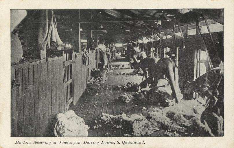 Keywords: StateLibQld 2 67323 Machine shearing at Jondaryan on the Darling Downs, Southern Queensland.jpg en Machine shearing at Jondaryan on the Darling Downs Southern Queensland Part of the Intelligence and Tourist Bureau Brisbane postcard series handle 10462/deriv/2276 Copied and digitised from a postcard PD-Australia StateLibQld-License Images of postcards from the State Library of Queensland Wool production in Australia Black and white photographs Sheep shearing Shearers Jondaryan Woolshed Intelligence and Tourist Bureau Brisbane postcard series |