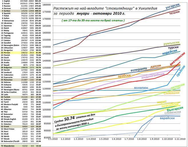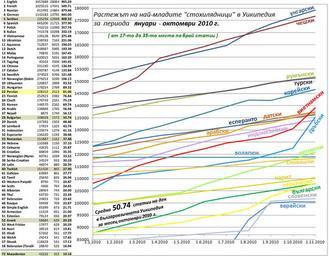 Keywords: Statistics Wikipedia 31.10.2010.jpg en Statistics_Wikipedia_31 10 2010 bg Класи ане на най-бъ зо аз астващите се азноезични Уикипедии за месец октомв и 2010 г Г афика на на астване на най-младите стохилядници за пе иода януа и - октомв и 2010 г own Stanqo Wikipedia statistics by language |