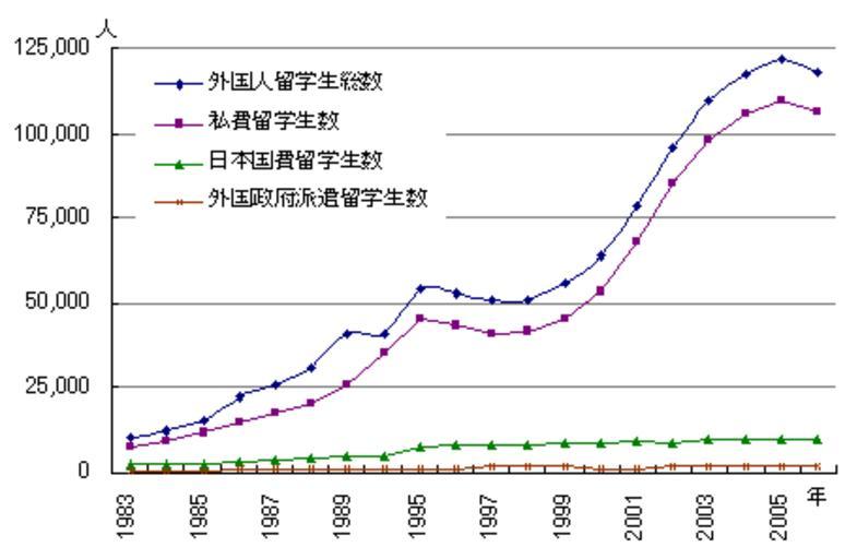 Keywords: StatisticsForeignStudentsInJapan.PNG en Numbers of foreign students in Japan Ministry of Education Culture Sports Science and Technology of Japan User Wirtz 2008-10-19 Education in Japan