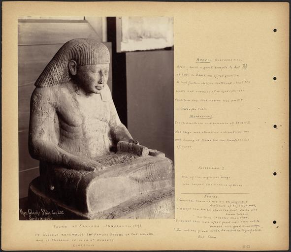 | Keywords: Statue of Egyptian Scribe.jpg Limestone Statue of Scribe Scrapbook page containing a photograph of a limestone statue of a scribe annotated with information about Egyptian rulers and a poem about the role of a scribe Subjects Egypt statue scribes Page size 33 x 38 1 cm Annotations Apepi- Shepherd King Apepi built a great temple to Set at Zoan or Tanis out of Red Granite It has fourteen obelisks scattered about the courts and avenues of winged sphinxes Tradition says that Joseph was prime minister for Apepi Menepthah I The thirteenth son and a successor of Ramses II His reign was a troublous and disastrous one and during it Moses led the Israelites out of Egypt Pasebxanu I One of the inglorious kings who helped the decline of Egypt Scribe Consider there is not an employment destitute of superior ones Except the scribe who is the first For he who knows letters he then is better than thee Shouldst thou walk after great men tou art to proceed with good knowledge Do not say proud words Be sealed in thyself alone Old Poem Language English photograph titled in French Rights No known restrictions Coverage Egypt Notes Title supplied by cataloger derived from captions or annotated information Format Scrapbooks Technique Photographs Albumen prints BPL Department Print Department Photo 1 Photographer Sébah J Pascal Title Mus Ghiseh statue don 205 scribe acroupie Caption Found at Sakkara January 31- 1893 It closely resembles the famous scribe of the Louvre and is possible of IV or Vth Dynasty Limestone Date ca 1860-1890 http //www flickr com/photos/boston_public_library/2469133428/ Limestone Statue of Scribe December 21 1892 March 8 1893 Flickr upload date 2008-05-01 17 12 William Vaughn Tupper Flickr uploaderhttp //www flickr com/photos/24029425 N06 BPL PD-old-100 Boston Public Library http //flickr com/photos/24029425 N06/2469133428 20 15 13 April 2011 UTC cc-by-2 0 Egyptian antiquities in the Isma'il Pasha palace Tupper Scrapbooks volume 26 Lower Egypt Ancient Egyptian seated scribes |