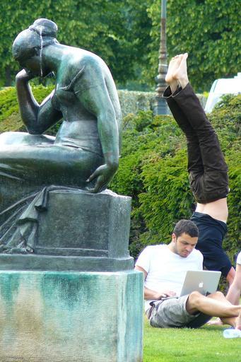 Keywords: statue fig sculpture melancholic monument woman copper bronze statue art artwork sculptor mourning sad pain park men man student pc apple handstand situation sitting sit relax break paris louvre museum