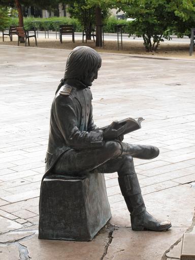 Keywords: statue reading man sitting bonaparte bronze j - p delights book sculpture outside city street valence france