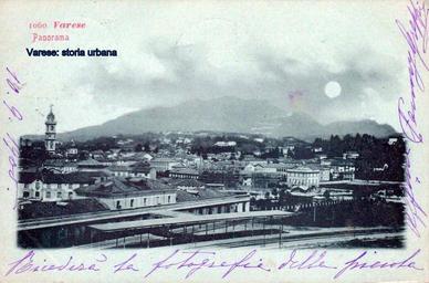 Keywords: Immagine presa da Giubiano, in basso a sinistra la stazione delle Ferrovie dello Stato (1865), alle sue spalle lo stabilimento della Carrozzeria Macchi e la cupola del Politeama. A destra l'imbocco di via Morosini con gli edifici ancora in costruzione tranne l'albergo Isola Magenta. varese |