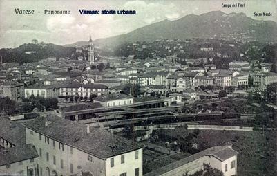Keywords: Immagine presa da Giubiano, in primo piano l'edificio dell'ospedale Del Ponte più sotto la stazione delle Ferrovie dello Stato (1865), alle spalle del quale si intravede la cupola del Politeama. A destra l'imbocco di via Morosini con l'albergo Isola Magenta. varese |