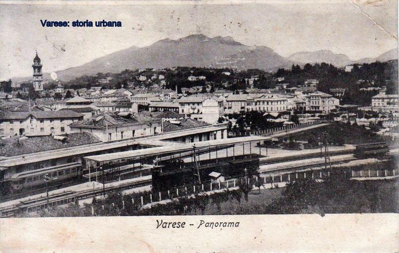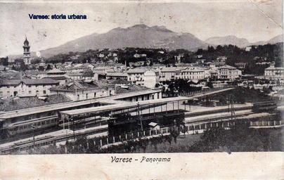 Keywords: Immagine presa da Giubiano, in basso a sinistra la stazione delle Ferrovie dello Stato (1865), alle sue spalle lo stabilimento della Carrozzeria Macchi e la cupola del Politeama. A destra l'imbocco di via Morosini con l'albergo Isola Magenta, all'estrema destra l'edificio del Calzaturificio di Varese. varese