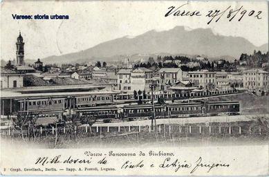Keywords: Immagine presa da Giubiano, a sinistra la stazione delle Ferrovie dello Stato (1865), a destra l'imbocco di via Morosini con l'albergo Isola Magenta. varese