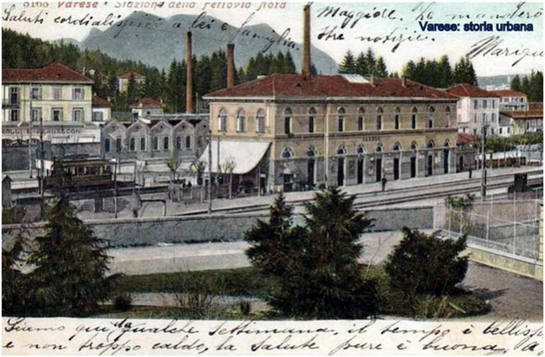 Keywords: Versione colorata. La stazione delle Ferrovie Nord Milano (1885) e il capolinea della tranvia per la Prima Cappella (1895) con un convoglio fermo. Sul piazzale con aiuole davanti alla stazione (odierna piazza Kennedy) si nota la recinzione di una villetta. Di fronte alla stazione lo stabilimento del Calzaturificio di Varese e le ciminiere dei Molini Marzoli Massari. tram varese
