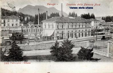 Keywords: varese tram outdoor La stazione delle Ferrovie Nord Milano (1885) e il capolinea della tranvia per la Prima Cappella (1895) con un convoglio fermo. Sul piazzale con aiuole davanti alla stazione (odierna piazza Kennedy) si nota la recinzione di una villetta. Di fronte alla stazione lo stabilimento del Calzaturificio di Varese e le ciminiere dei Molini Marzoli Massari. La stazione delle Ferrovie Nord Milano (1885) e il capolinea della tranvia per la Prima Cappella (1895) con un convoglio fermo. Sul piazzale con aiuole davanti alla stazione (odierna piazza Kennedy) si nota la recinzione di una villetta. Di fronte alla stazione lo stabilimento del Calzaturificio di Varese e le ciminiere dei Molini Marzoli Massari. |