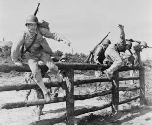 | Keywords: Steeplechase1.tif Camp Edwards Massachusetts In perfect steeplechase form these soldiers of the anti-aircraft training center fling themselves over the five-foot rail fence Par for the course is three and a half minutes Library of Congresshttp //hdl loc gov/loc pnp/fsa 8e00113 ~ 1942 U S Army Signal Corps Partially restored version of File Steeplechase jpg Rotated and cropped Dust scratches dirt and fibers removed No other changes This version retained in case additional edits become necessary See also File Steeplechase2 jpg full restoration compressed and File Steeplechase2 tif full version uncompressed PD-USGov Camp Edwards Obstacle courses Military uniforms of World War II |
