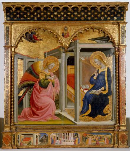 Keywords: Stefano d'Antonio di Vanni - The Annunciation - Google Art Project.jpg non-free frame 1405 1483 Stefano 27695395 d'Antonio di Vanni Italian 1405 - 1483 /collection/the-walters-art-museum/artwork/the-annunciation-stefano-dantonio-di-vanni/27783216/ 36492 Stefano d'Antonio di Vanni Artist /artist/stefano-dantonio-di-vanni/27864004/ 27864004 /collection/the-walters-art-museum/ The Walters Art Museum 27751297 http //thewalters org/ /collection/the-walters-art-museum/artwork/the-annunciation-stefano-dantonio-di-vanni/27783216/ 1418 ca 1430 Renaissance tempera and gold leaf on panel Stefano Bardini Collection prior to 1890 mode of acquisition unknown cited in Fiorenza Scalia La citta degli Uffizi-Florence 1982 p 46 with 1890 photo of Bardini Gallery showing this painting; Lawrence W Hodson Wolverhampton Compton Hall England date and mode of acquisition unknown; Sale Christie's London June 25 1906 no 187 as early Italian school; C Fairfax-Murray London and Florence 1907 mode of acquisition unknown; Henry Walters Baltimore 1913 by purchase Bernard Berenson as agent; Walters Art Museum 1931 by bequest 164 4 27783216 False 1442 /collection/the-walters-art-museum/level/charles-street-third-floor/27821728/ Charles Street Third Floor 37 448 http //art thewalters org/detail/36492 The Walters Art Museum Acquired by Henry Walters 1913 altarpieces; paintings 1410 1450 Florence Italy Place of Origin w144 x h164 x d25 cm ca 1430 Renaissance False 0 859375 http //creativecommons org/licenses/by-nc-sa/3 0/ Object /collection/the-walters-art-museum/level/charles-street-third-floor/27821728/13th-15th-century-italian-art/27748228/ 13th-15th Century Italian Art the-annunciation-stefano-dantonio-di-vanni The Annunciation a 144 7 Transcription In the halo of the archangel counter-clockwise AVE MARIA GRATIA PLENA DNS TECV; Transcription In the halo of the Virgin clockwise ECCE ANCILLA DOMINI FIAT M M ; Transcription On the book lying near the door FEMIA / CIRCI / DABIT / VIRVM / IEREM / IA PHA / 31; Transcription On the book held by the Virgin ECCE VIR / GO CONC / IPIET ; Transcription Across the base of the main panel on the frame dividing it from the predella O BENE FECVNDA VIRGINITAS QVE NOVO INAVDITOQUE GENERE ET MATER DICI POSSIT ET VIRGO tempera and gold leaf on panel Stefano Bardini Collection prior to 1890 mode of acquisition unknown cited in Fiorenza Scalia La citta degli Uffizi-Florence 1982 p 46 with 1890 photo of Bardini Gallery showing this painting; Lawrence W Hodson Wolverhampton Compton Hall England date and mode of acquisition unknown; Sale Christie's London June 25 1906 no 187 as early Italian school; C Fairfax-Murray London and Florence 1907 mode of acquisition unknown; Henry Walters Baltimore 1913 by purchase Bernard Berenson as agent; Walters Art Museum 1931 by bequest special url_id -wGSQda01U2QWw PD-old-100-1923 1483 Google Art Project works by Stefano d'Antonio di Vanni Stefano d'Antonio di Vanni Paintings of Annunciation in Italy Ecce Virgo |