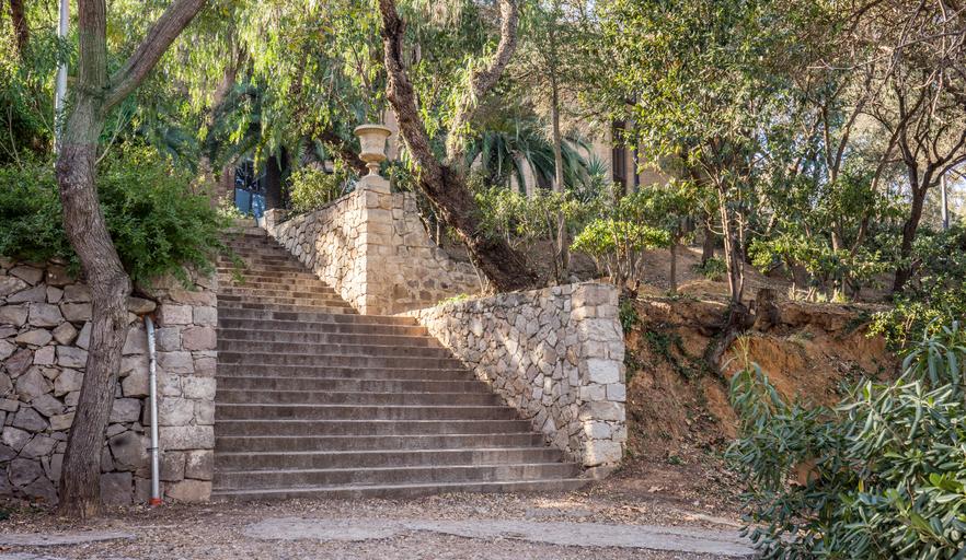 Keywords: steps stairway park nature outdoor barcelona spain garden outside tree sunny green environment landscape