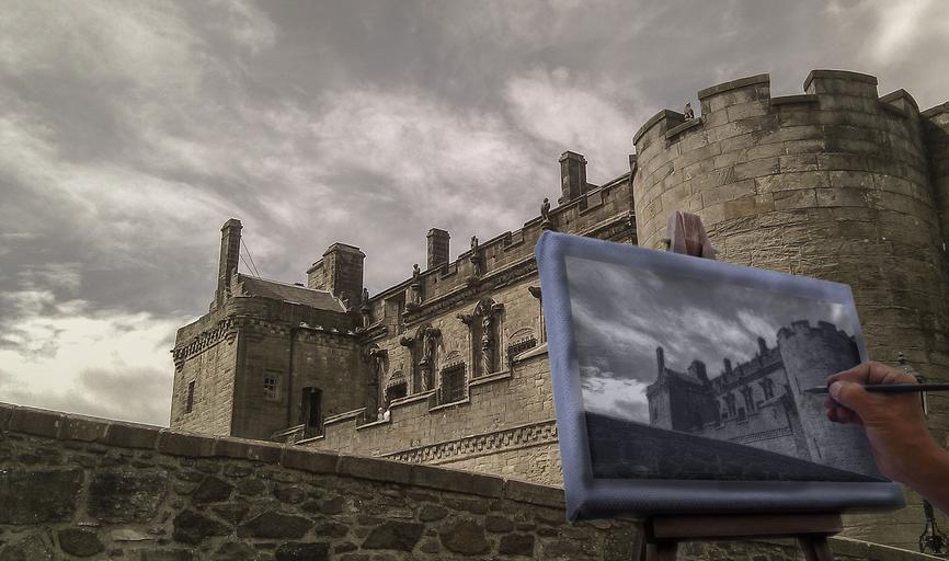 Keywords: sterling castle castle sky clouds easel hand draw drawing pencil pencil drawing background light shadow middle ages battlements grey places of interest stone wall scotland sterling fortress country estate