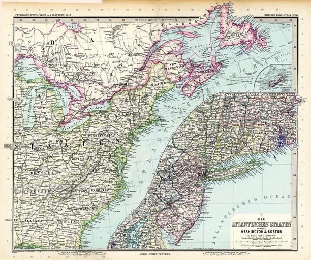 Keywords: Stielers Handatlas 1891 80.jpg 79 81 West-Indien in 4 Blättern Bl 2 die Atlantischen Staaten zwischen Washington Boston West Indies North America in 4 sheets sheet 2 the Atlantic states between Washington Boston Petermann West-Indien Bearbeitet von H Habenicht rev von Dr R Lüddecke 1888 1889 Petermann August Heinrich 1822-1878 119408953 Habenicht Hermann 1844-1917 116349174 Lüddecke Richard Carl 1859-1898 123921562 Old maps of the United States