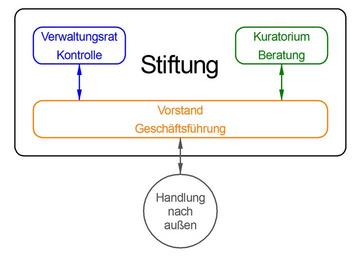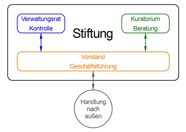 Keywords: Stiftungsorgane.png de Beispiel für eine Stiftung mit drei Stiftungsorganen Ein Vorstand orange führt die Geschäfte und vertritt die Stiftung nach außen und nach innen ein Verwaltungsrat blau kontrolliert den Vorstand und ein Kuratorium grün berät den Vorstand own Membeth 2016-07-18 Foundations organizations Cc-zero |