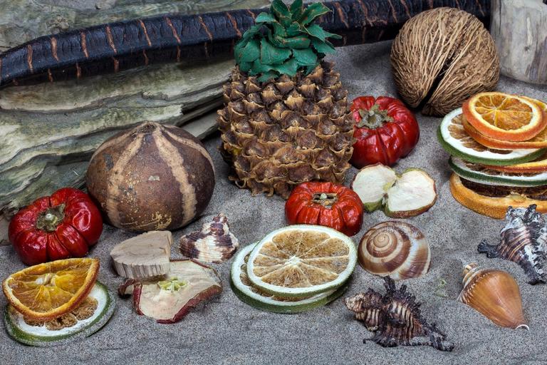 Keywords: still life fruits dry citrus fruits pineapple mussels sand