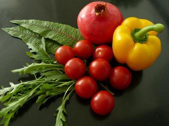 Keywords: still life paprika tomato pomegranate lettuce vegetable scale