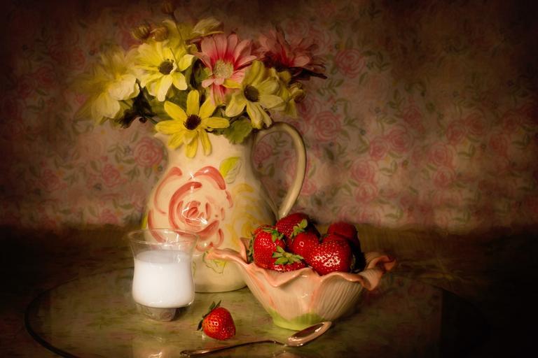MAKE A MEME View Large Image still-life strawberries in a bowl cream table setting