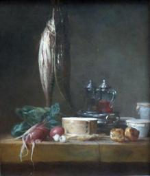 MAKE A MEME View Large Image Still Life with Fish, Vegetables, Gougères, Pots, and Cruets on a Table by Jean-Baptiste Siméon Chardin.jpg en Still Life with Fish Vegetables Gougères Pots and Cruets on a Table oil on canvas painting by Jean-Baptiste Siméon Chardin ...