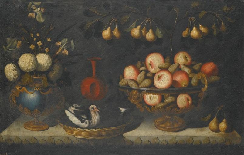 | Keywords: Still Life with Flowers in Vase, Apples & Pears by Bernardo Polo.jpg en Still Life with Flowers in a Gilt-Mounted Bluestone Vase and a Bowl of Apples with a Sprig of Pears by Bernardo Polo c 1650-75 oil on canvas 73 by 112 cm Sotheby's Bernardo Polo c 1650-75 Bernardo Polo PD-old-100 |