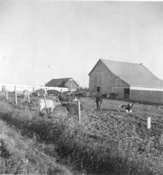 | Keywords: mennonite community mennonitecommunity agriculture farming rural life rurallife buildings stirling alberta cattle blackandwhite monochrome outdoor black and white Caption: August 3, 1948. Stirling, Alberta. Cattle by the barn at the Mennonite colony.  Citation: Mennonite Community Photograph Collection, 1947-1953. Land and Buildings. HM4-134 Box 2 Photo 403.8-3. Mennonite Church USA Archives - Goshen. Goshen, Indiana. Caption: August 3, 1948. Stirling, Alberta. Cattle by the barn at the Mennonite colony.  Citation: Mennonite Community Photograph Collection, 1947-1953. Land and Buildings. HM4-134 Box 2 Photo 403.8-3. Mennonite Church USA Archives - Goshen. Goshen, Indiana.  |