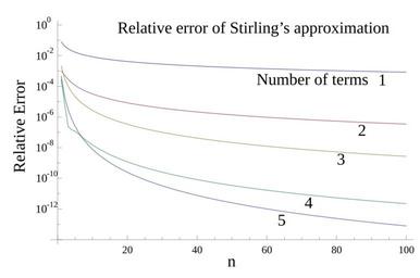 Keywords: StirlingErrorGraphBB.svg en Relative Error of Stirling's approximation for n from 1 to 100 with 1 to 5 terms Own DMJ001 2009-02-15 No Computed in Mathematica with 400 digit precision Stirling's approximation