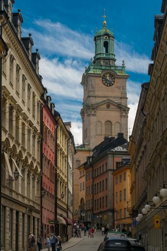 Keywords: stockholm sweden church old town building alley belfry clock history