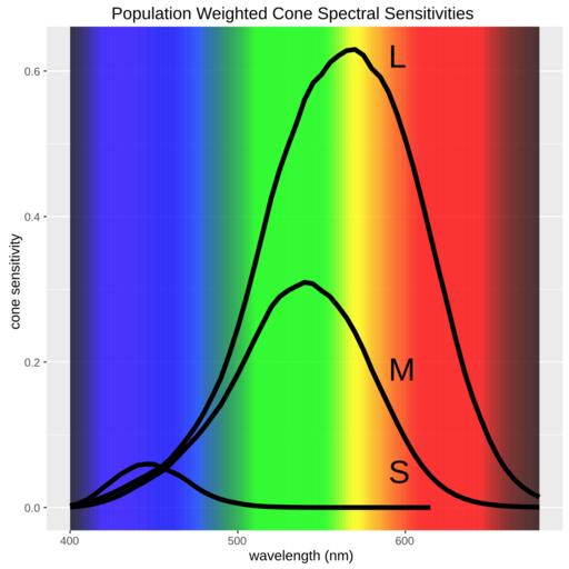 | Keywords: Stockmansharpe10degCMFadj2000 popconsens.svg en Population weighted L 63 M 31 S 6 cone spectral sensitivities from Stockman and Sharpe using 'colorscience' package for R Source code library ggplot2 library tidyr library colorscience library ggspectra o df<-StockmanSharpe10degCMFS2000 colnames o df c wavelength L M S o df lms<-c L M S lin df<-o df lin df lin df L<-lin df L 0 63 lin df M<-lin df M 0 31 lin df S<-lin df S 0 06 t df <- lin df > gather cone type response L S t df response ggplot t df aes x wavelength y response group cone type + stat_wl_strip alpha 0 4 ymin -Inf ymax Inf + scale_fill_identity +geom_line color black size 2 +geom_text data t dft df wavelength 590 aes label cone type size 8 hjust 0 vjust -1 +labs title Population Weighted Cone Spectral Sensitivities x wavelength nm y cone sensitivity +xlim 400 680 + theme text element_text size 10 ggsave stockmansharpe10degCMFadj2000_popconsens svg cc-zero Color vision |