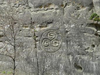 Keywords: stone rock steinzeichnung relief characters ornament pattern triskelion importance triskel symbol image radialsymmetrisch arcs open spiral spirals new stone age celts celtic mythology mythology mystical sand stone petroglyph felsbild engraving scraped picked rock single incision |