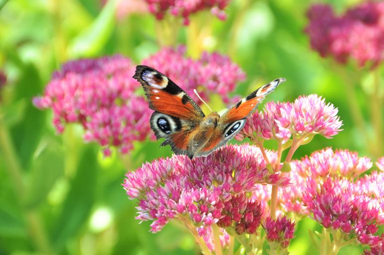 Keywords: stonecrop peacock butterfly butterfly flora plant pink flowers wing
