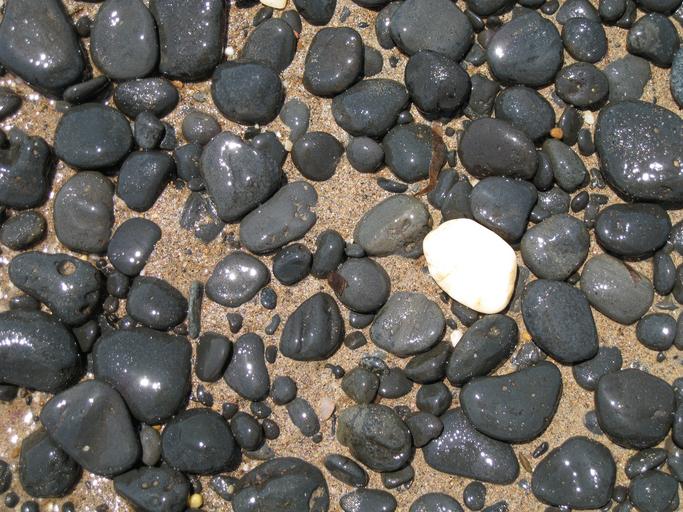 Keywords: stones pebble beach background pattern brown black pebbles sand mussels shiny matt water sea